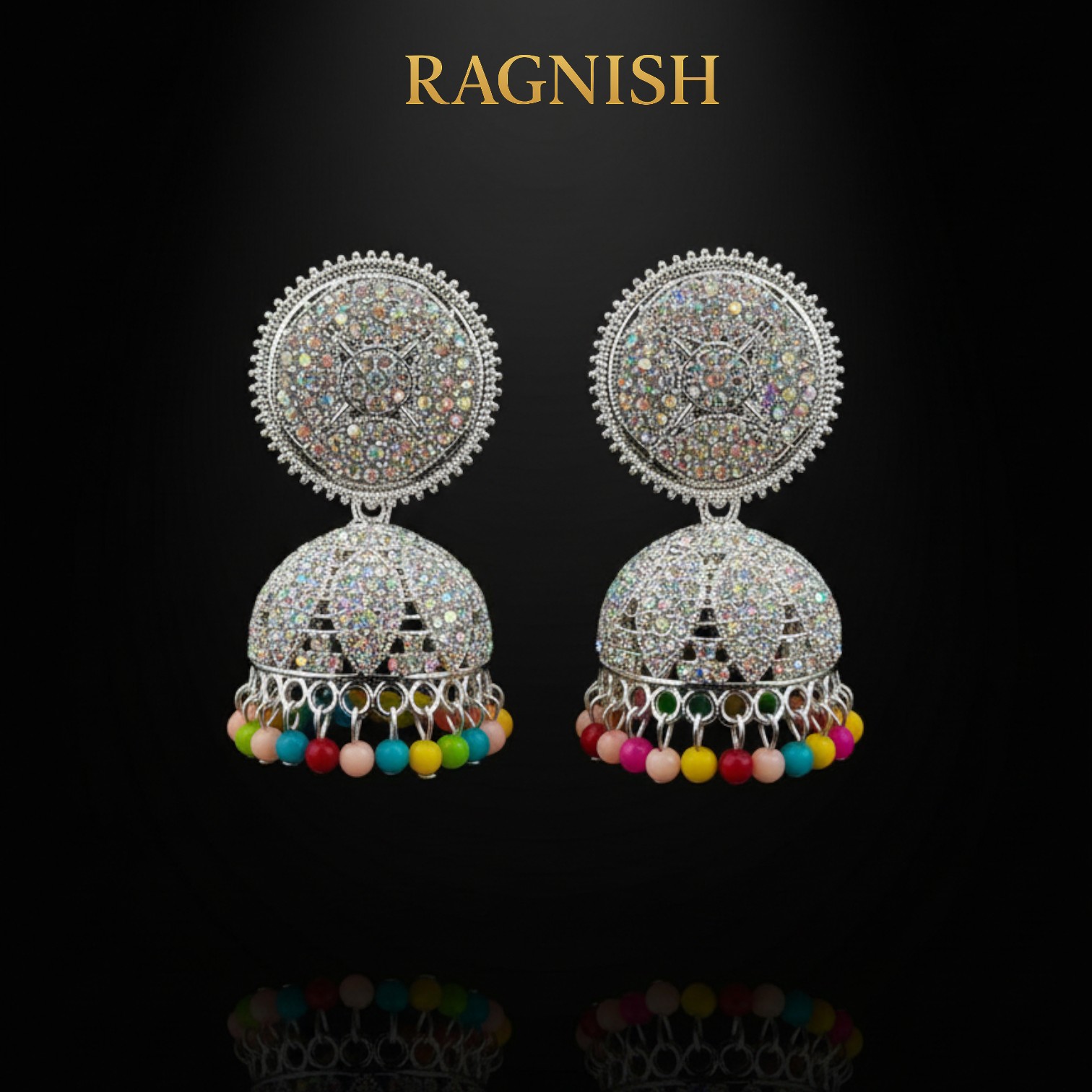 The Navrang Crystal Jhumka Earrings by RAGNISH are a spectacular fusion of traditional artistry and celebratory color. Designed to capture attention, these luxurious earrings feature a beautifully detailed, circular rhinestone stud attached to an equally dazzling, bell-shaped jhumka. Every surface is meticulously set with clear and iridescent rhinestones that shimmer with every turn.