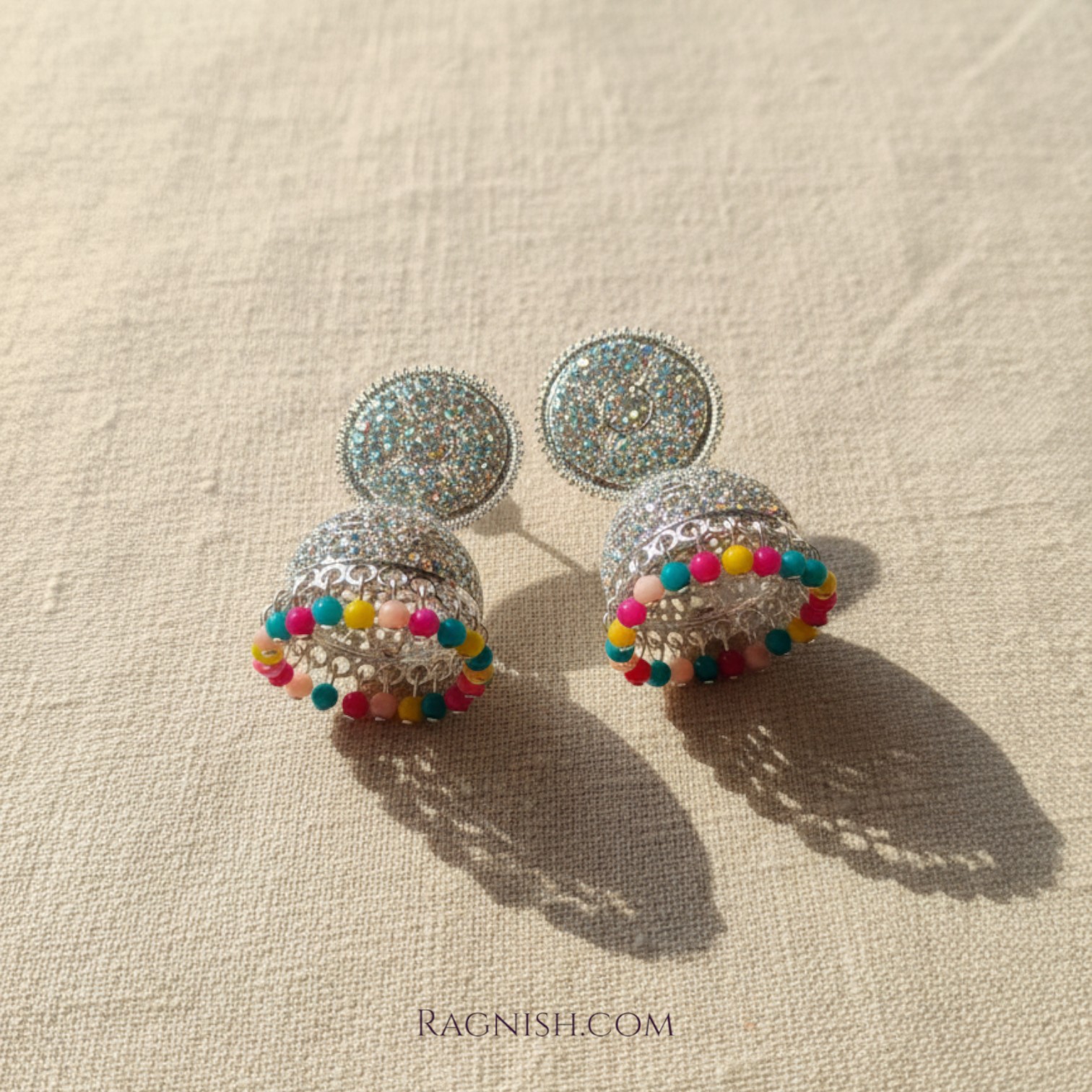 What truly sets these earrings apart is the lively fringe of multicolored beads (in shades of pink, yellow, blue, and red) dangling from the base of the jhumka bell. This detail, inspired by the joyous festivals and vibrant street markets of India, adds a contemporary and whimsical touch.